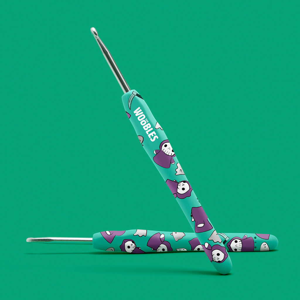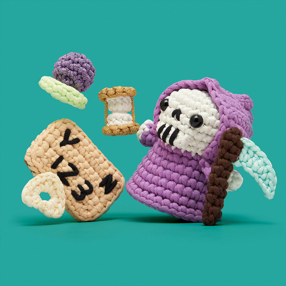 When it comes to thrills and chills, we Halloween-lovin’ Wooblers are definitely in our happy place. And that means that some of our Halloween-credible Woobles are simply Dying to Meet You! Mort the Grim Reaper is first in line, with his glow-in-the-dark face and a whole assortment of spook-tacular accessories: a Tiny Scythe, Tiny Hourglass, Tiny Crystal Ball, and Tiny Spirit Board. Luckily, with only Beginner and Beginner+ skills swirling about, you’d be dead wrong to assume that any of these are too tricky. In fact, our Easy Peasy Yarn™ and step-by-step videos make everything simple enough even for wooblin’ newbies. So dust off your robes and get ready for a ghoulishly Grim-credible time!