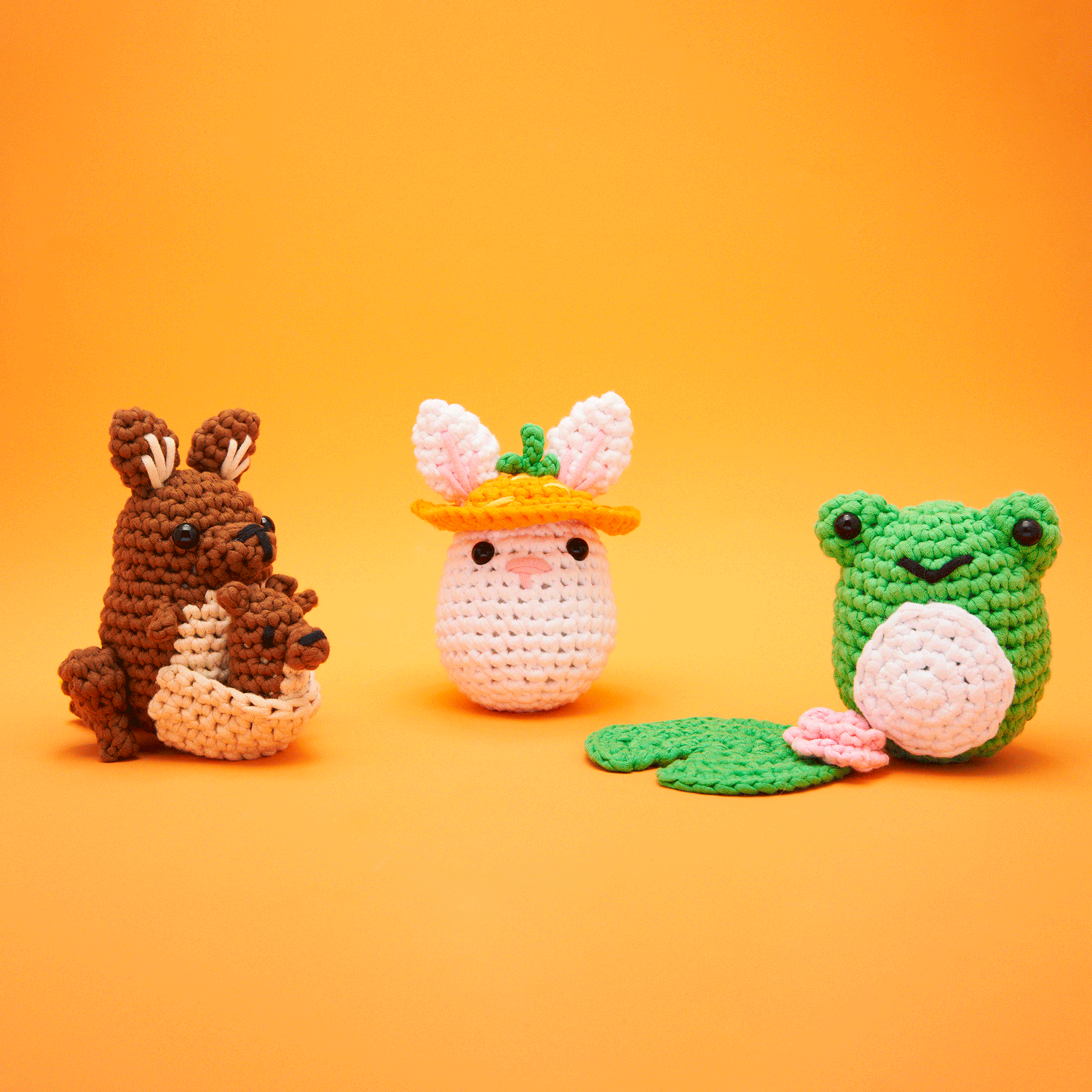 For an extra dose of woobly good cheer, come check out this Hop-solute Hoppiness Bundle! Featuring the hoppiest Woobles and their adorable accessories, this cute collection is sure to have you jumping with joy.Including Intermediate, Beginner and Beginner+ kits, this bundle is perfect for starting out slow, then hopping up to some slightly more advanced techniques. And with our Easy Peasy Yarn™ and step-by-step videos, you’ll soon be bonding with Bella the Kangaroo and sweet Baby Bella, Jojo-king around with Jojo the Bunny and her Tiny Carrot Hat, and kicking it with Henri the Frog and his Tiny Lily Pad. So let’s hop to it, ’cause Hop-solute Hoppiness is just a hop, skip, and a jump away!